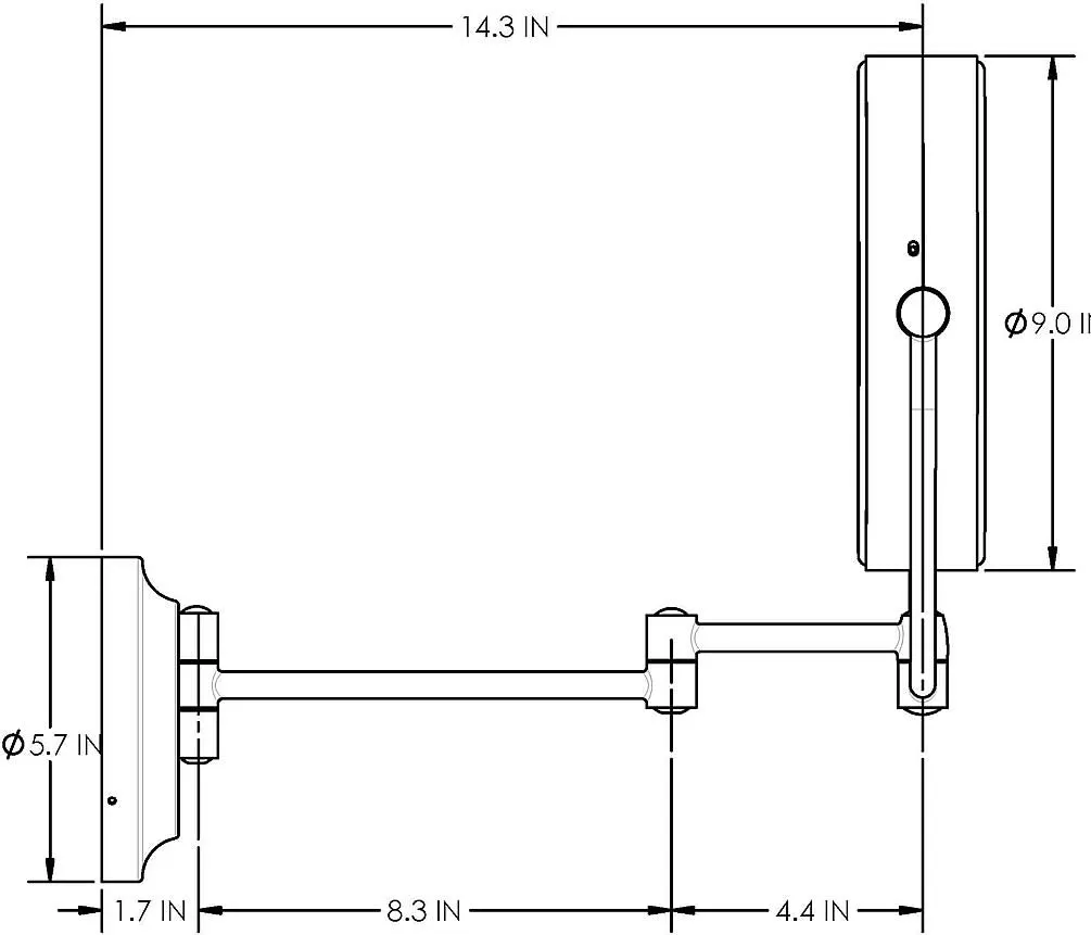 • Dimensions: 6.5" Diameter viewing area in 9" Diameter x 2.2" frame. Base: 5.75" diameter x 1.88" Deep with switch. Retracted Size: 14" High x 12" Wide x 3.25" Deep. 6.83 lbs. Offset height from center of the mirror to center of mounting plate: 6". Maximum extension from wall: 15.25"