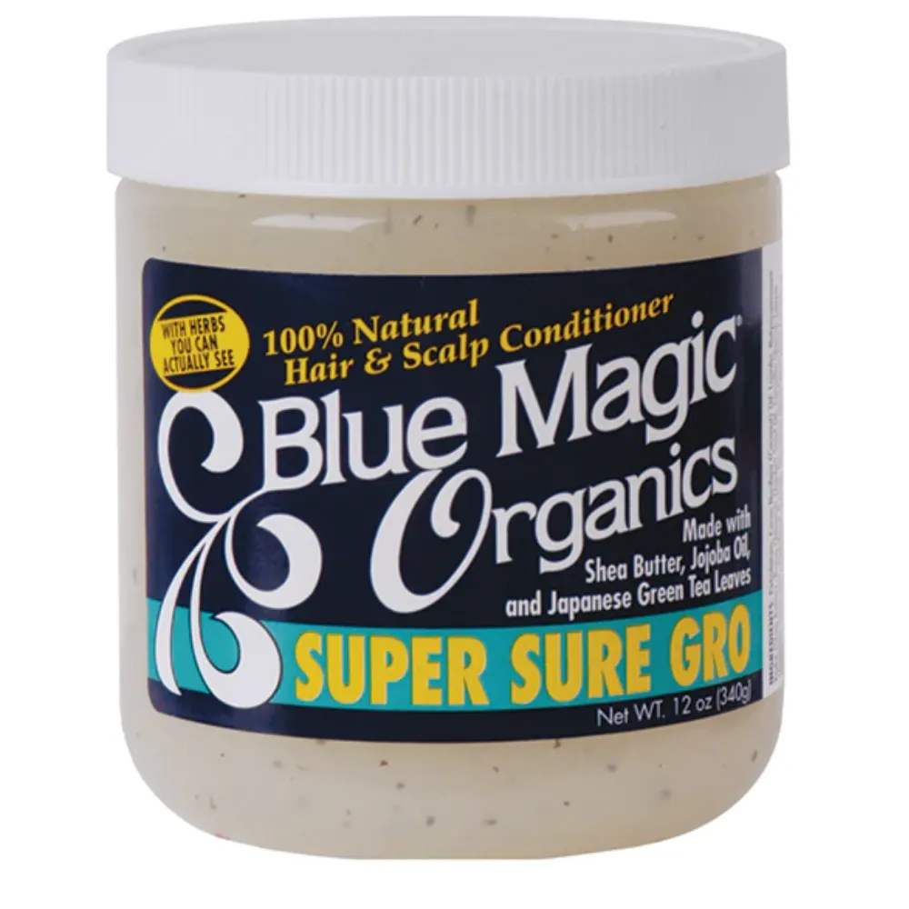 Blue Magic Super Sure Gro is an invigorating hair and scalp conditioner made with Shea Butter, Jojoba Oil, and Japanese Green Tea leaves. It prevents breakage to create longer and healthier hair. Super Sure Gro is the 100% natural conditioner your hair will love!