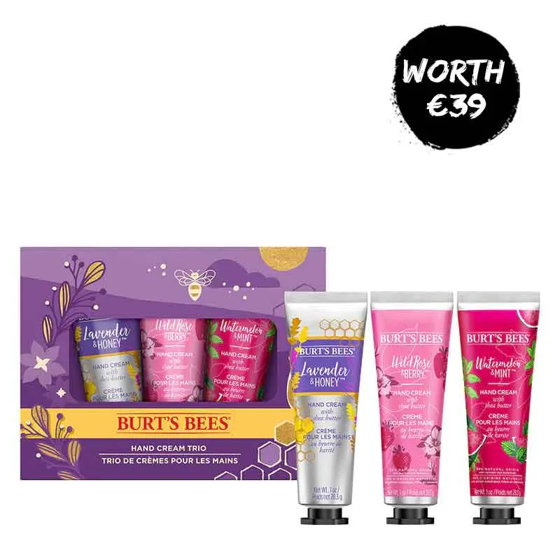 Burt's Bees Hand Cream Trio Gift Set is a naturally nourishing treat for hard-working hands. With Lavender & Honey, Wild Rose & Berry and Watermelon & Mint hand creams, this gift set will leave hands wonderfully soft and blissfully fragrant.