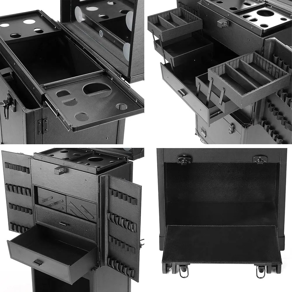 - Cosmetic Case with overall dimensions of 16"x11"x38", features an appliance holder, 4 extendable trays, brush holders, 2 drawers and bottom case.