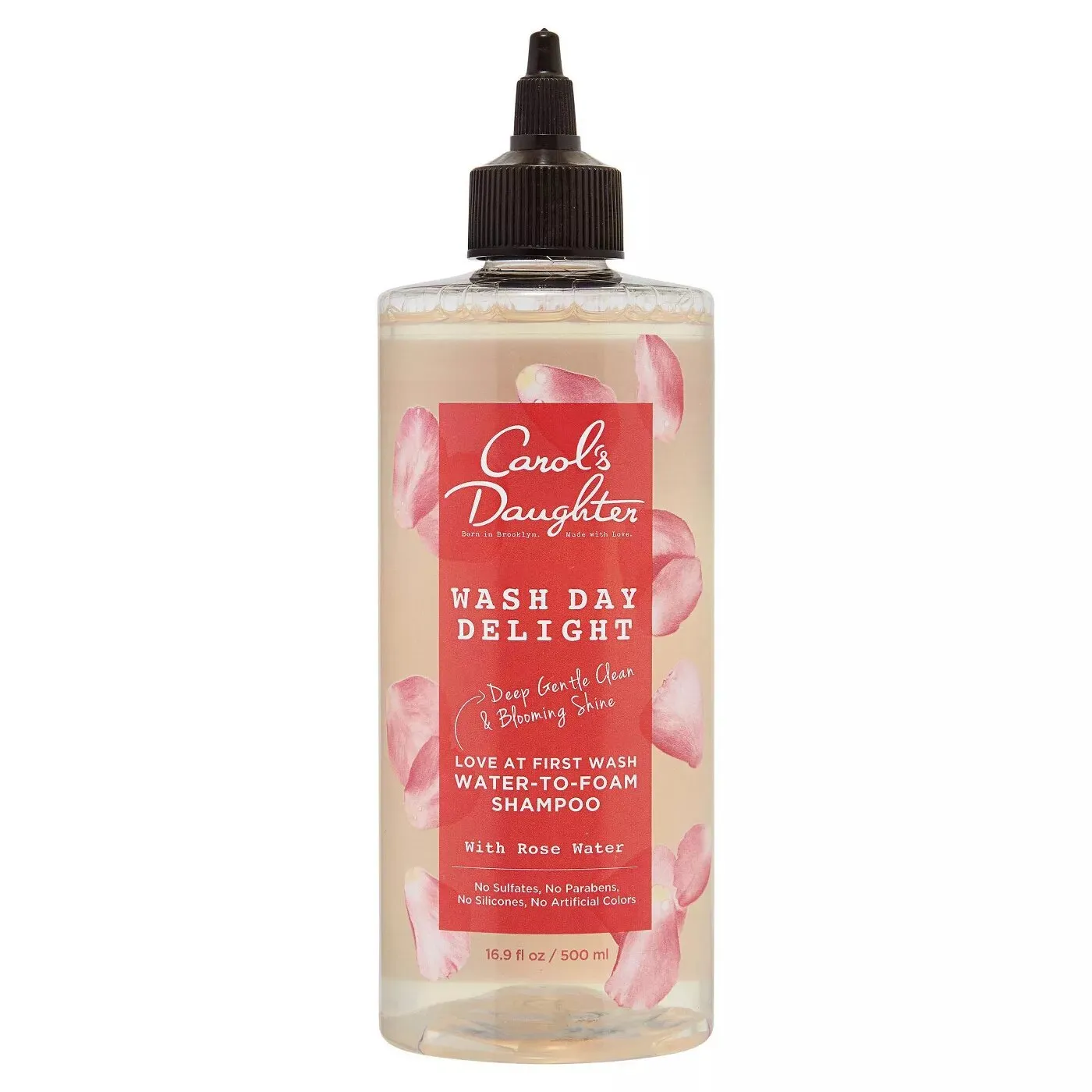 Carol's Daughter Wash Day Delight micellar cleansing vegan shampoo with Rose Water transforms from a water to a gentle foam lather for a deep clean without stripping or harsh friction to help cut down time on wash day. Perfect for natural, curly, kinky and coily hair, our targeted applicator helps the liquid formula instantly flow through hair providing easy scalp access and quickly rinses clean.