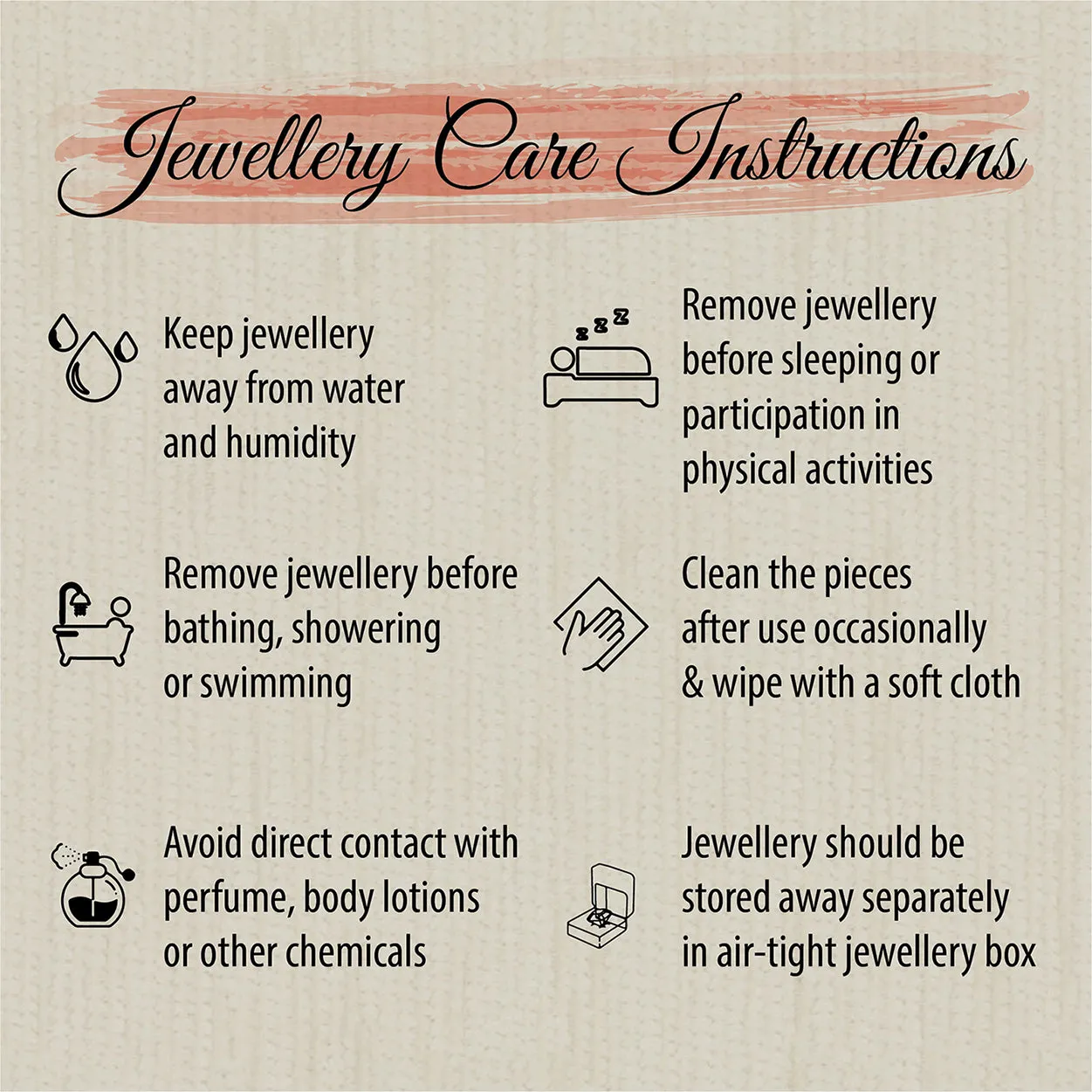 - Avoid contact with direct heat, water & organic chemicals i.e. perfumes, deodorants, sprays & other strong chemicals as they may react with the metal/ plating. When not in use store jewellery in air-tight boxes/ a cloth pouch to retain its shine.