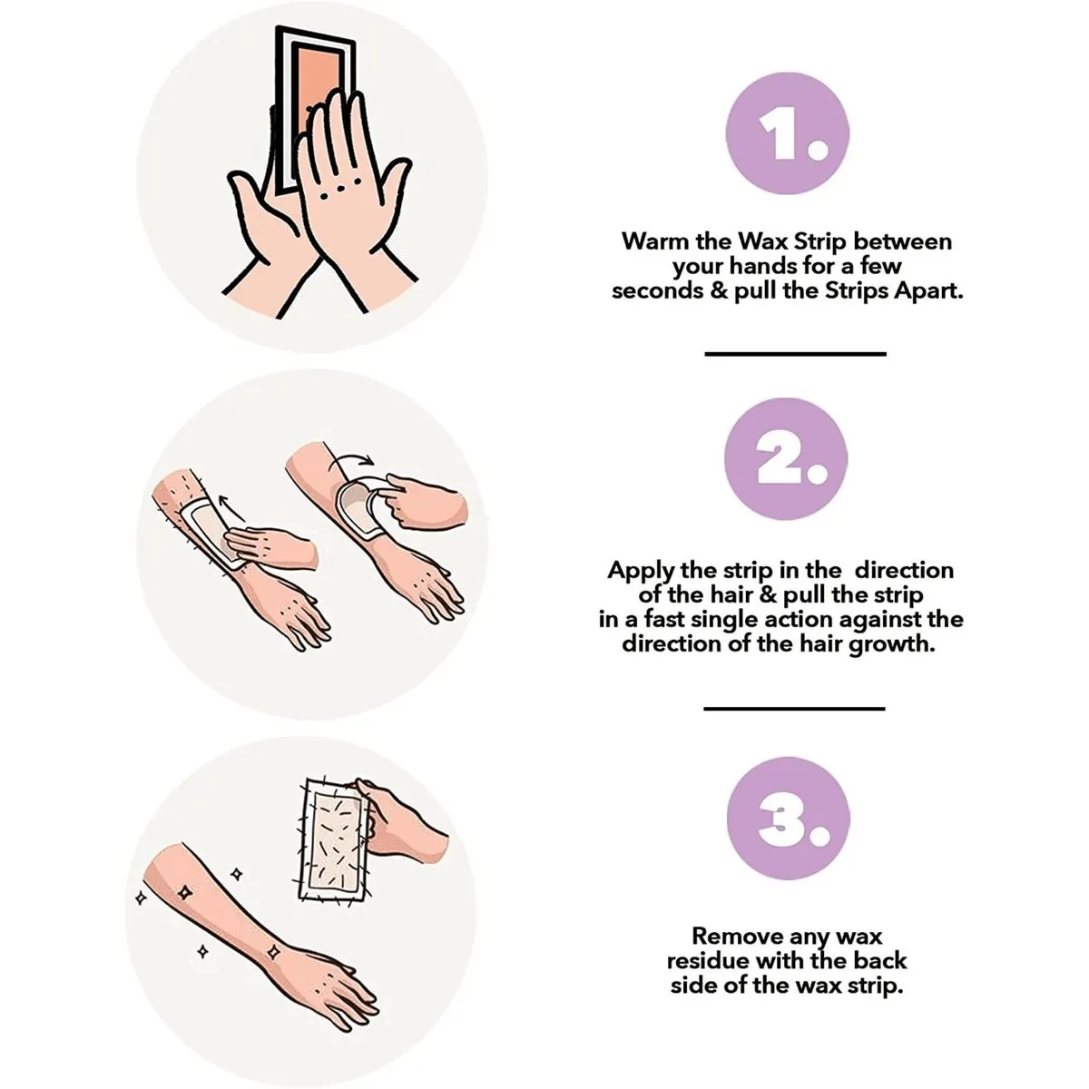 - HOW TO USE : 1.Warm the Wax Strip between your hands for a few seconds and pull the strips apart. 2.Apply the strip n the direction of the hair and pull the strip in a fast single action against the direction of the hair growth. 3.Remove any wax residue with the post-wax skin care wipes.