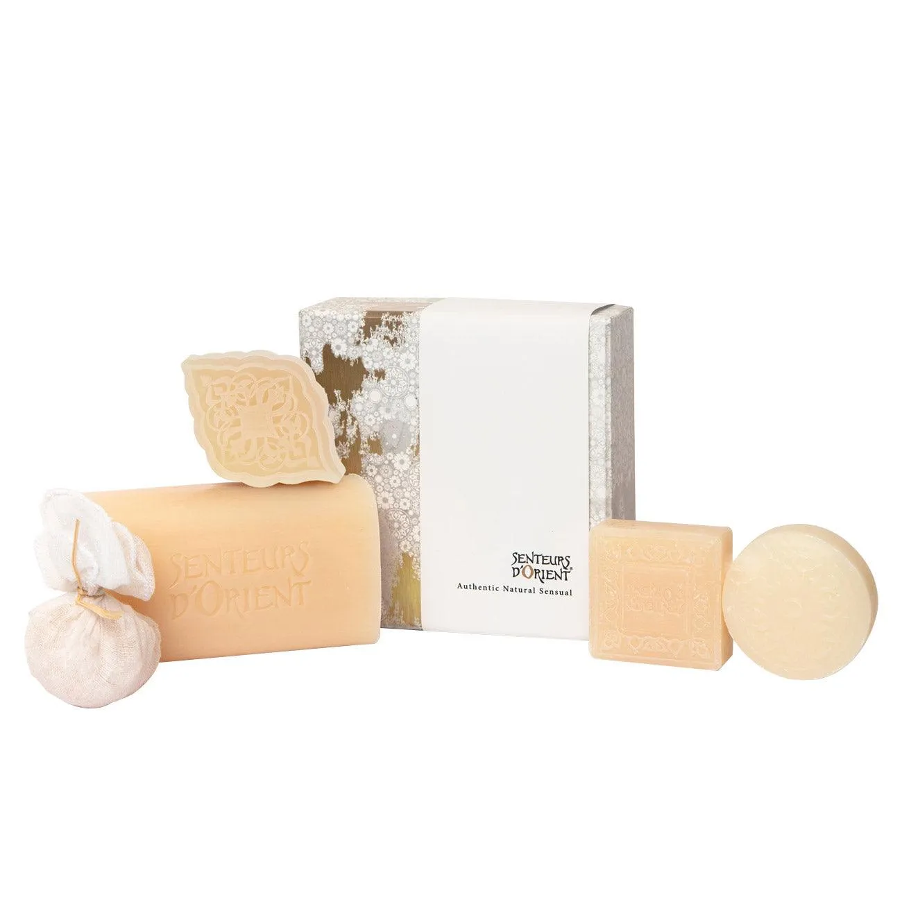 Comes with a Jasmine of Arabia rough-cut bar soap, 3 mini soaps of Orange Blossom, Velvety Gardenia and Sensual Tuberose and 1 Jasmine of Arabia bath salt pouch.