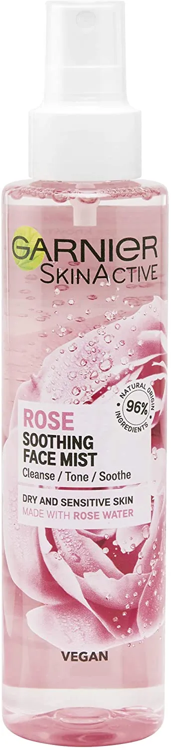 Hydrate your skin and leave it glowing and feeling soft with the Garnier Rose Soothing Face Mist. Use anytime throughout the day for a boost, with no need to rinse off. Enriched with rose water to soothe the skin, suitable for dry and sensitive skin.