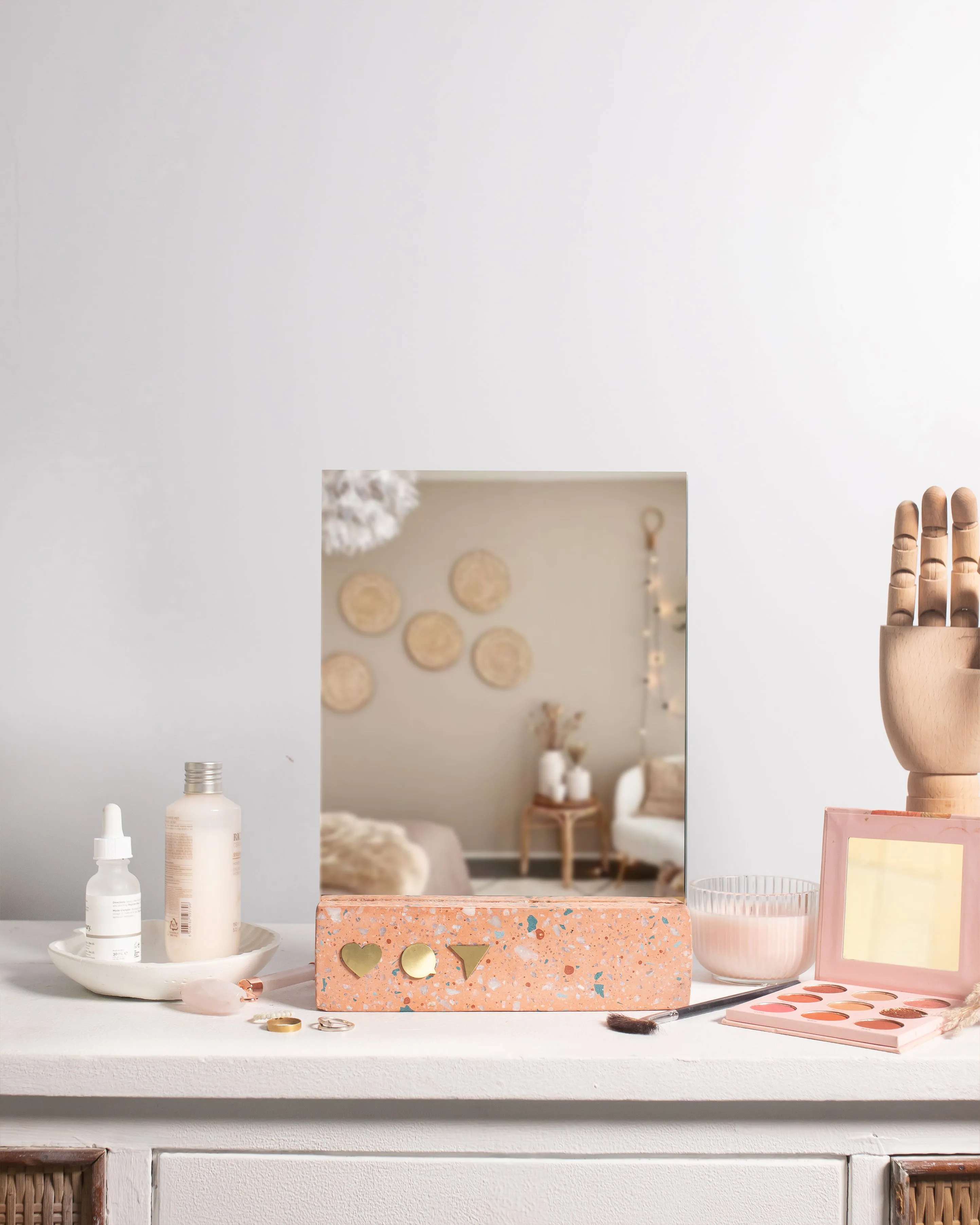 Add a playful touch to your vanity, dresser, or desk with the compact Insta Mirror and aesthetically capture those chic selfies and memorable moments! The design identity of the mirror has been heightened with the addition of brass elements, mimicking the like, share, and comment icons as seen on the celebrated app.