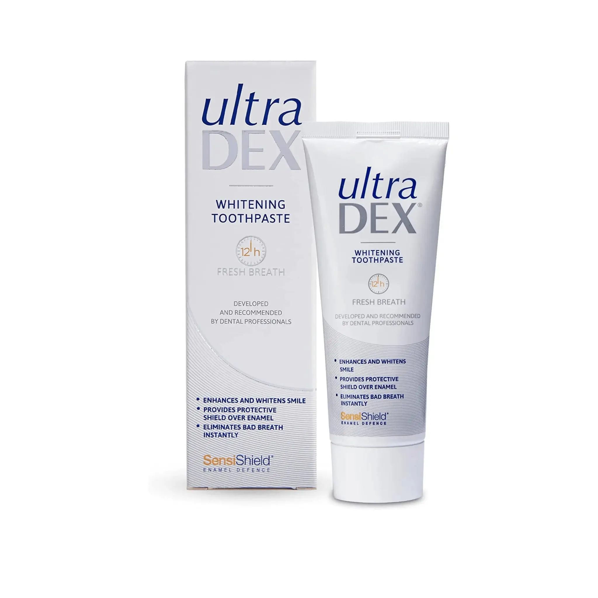 Ultradex Whitening Devleoped for sensitive teeth, the advanced patented technology is clinically proven to instantly eliminate bad breath compounds (Volatile Sulphur Compounds) for 12 hour fresh breath confidence, as well as helping to rebuild tooth surfaces to leave teeth stronger, smoother and brighter. Brushing twice a day instantly eliminates bad breath, protects teeth & gums by inhibiting harmful bacteria and restores natural teeth whiteness by gently lifting everday stains. UltraDEX is backed by scientific research and clinically proven technology and has been developed, used and recommended by Dental Professionals for over 20 years. UltraDEX Sensitive Toothpaste has a mild mint flavour. Free from sulphates and harsh abrasives. Contains fluoride, non-foaming. Registered with The Vegan Society.