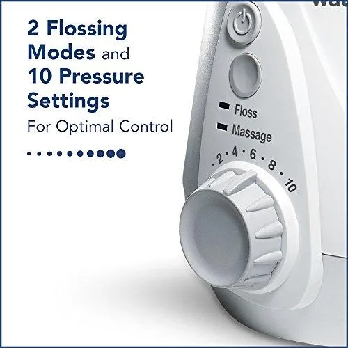 - 7 flosser tips, 10 pressure settings for gentle to maximum cleaning, 650 ml water reservoir for 90 seconds of flossing time